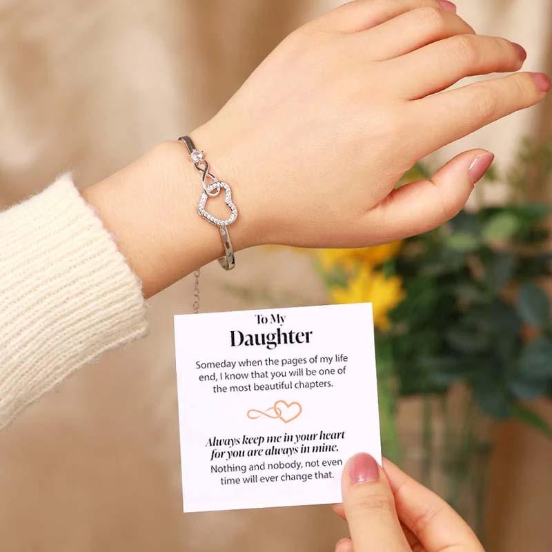 Crafted with an interlocking infinity and heart pendant, it embodies endless love and cherished moments. Each bracelet comes paired with a heartfelt message card: "To My Daughter, someday when the pages of my life end, I know you'll be one of the most beautiful chapters.